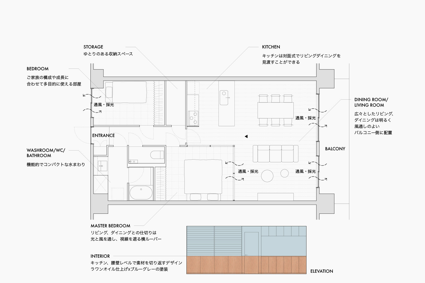 水回り、個室は玄関側にコンパクトにまとめ、日当たりのよいバルコニー側に家族が多くの時間を過ごすリビングとダイニングを大きくとったプランです。既存の位置や配管スペースに沿って壁配置することで極力凹凸のない整形の居室となるよう配慮しています。寝室は窓に面さないため、LDKとの間の仕切りは腰壁とし、視線は通さず光と風を通す横ルーバーの建具を設えました。空間全体の壁面は腰壁とキッチンの高さと同じ床上900mmのラインで仕上げを切り替えています。下部は木目の美しいラワン合板のオイル仕上げ、上部はブルーグレーの塗装としています。異なる素材のコントラストが空間を引き締めるとともに本件のアイデンティティとなることを意図して提案しました。